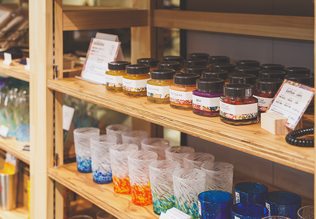 ビールや公式グッズ以外にも、琉球グラス、やちむんなどの工芸品や、ビールに少し加えるだけで新たな味を楽しんで頂ける沖縄の果物を使ったコンフィチュール、おつまみとして楽しんで頂ける沖縄の産品を活用した食品など、沖縄の原料や工芸、技術を使用した商品を販売しています。